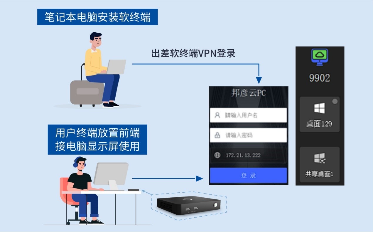 不僅如此,在遠(yuǎn)程訪問(wèn)和移動(dòng)辦公的應(yīng)用價(jià)值上,實(shí)施邦彥云PC解決方案后,員工可以通過(guò)云PC用戶(hù)終端或軟終端(部署在筆記本、平板或手機(jī))在公司內(nèi)部和外部遠(yuǎn)程訪問(wèn)個(gè)人計(jì)算刀片辦公,滿(mǎn)足了移動(dòng)辦公、出差辦公等場(chǎng)景的需求。