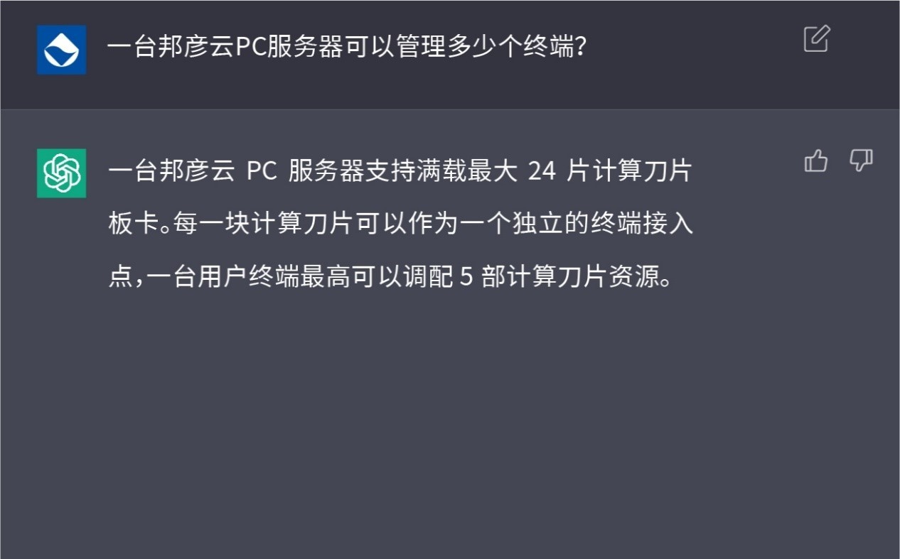 一臺邦彥云PC服務(wù)器支持滿載最大24片計(jì)算刀片板卡。每一塊計(jì)算刀片可以作為一個獨(dú)立的終端接入點(diǎn),一臺用戶終端最高可以調(diào)配5部計(jì)算刀片資源。